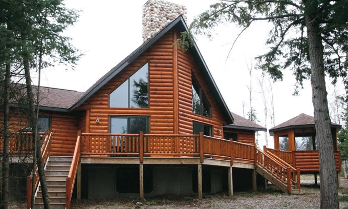 Welcome to Moose Lodge, a beautiful 3-bedroom, 3-bath executive log home tucked along the peaceful shoreline of private Landing Lake, just west of Land O’ Lakes, Wisconsin. With rustic charm, modern comforts, and plenty of space to unwind, Moose Lodge is perfect for families, groups, or anyone looking to relax in the Northwoods.