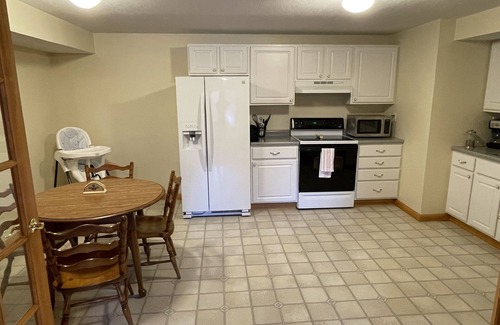 There is access to the lower level that offers an apartment setting. The family room on this level has large TV, streaming avialable with guest accounts. We also have foosball table.
