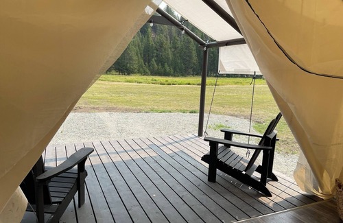 Be our guest in the Moose Tracks glamper. The tent includes a queen size bed and simple furnishings. For extra comfort there are plenty of blankets for the cool nights and a fan for the hot ones. Tent has a nice covered porch with seating for 2 that overlooks the river area and mountains behind it. ****** NEW THIS YEAR***** Full bathhouse with flushing toilets and indoor showers and power to plug in whatever you may need!!