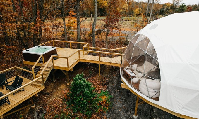 Nature meets luxury in this unique glamping dome experience. Enjoy the privacy of a peaceful, secluded setting, complete with everything you need for a one-of-a-kind getaway. Heating and A/C, full bathroom, Luxury Saatva mattresses & bedding. Functional kitchenette, and private outdoor living space with private hot tub and natural gas fire pit.