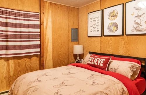 Quiet location, small rustic cabin. We have 2 bedrooms and sleeping loft. One bedroom has queen bed, another bunk bed, sleeping loft has single bed.