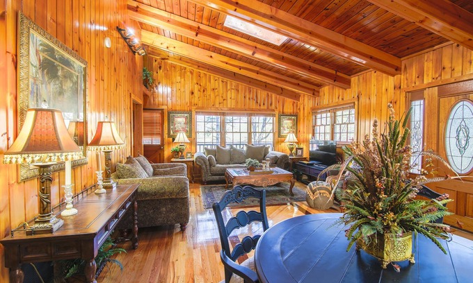 The air conditioned/heated two-level cabin is 1856 square feet under air and has three separate exterior decks both covered and open offering over 2700 square feet in total of living space. The upper unit is bright and open and over 1100 sq ft in size. The home sits on just under a half acre with a large private driveway for free secure parking. The upper level also has its own separate entry with one huge bedroom connected to a very large en-suite. Part of the bathroom has a large beautiful corner Jacuzzi tub, big glass door walk in shower and sink. In addition, there is a toilet closet with access from the kitchen and the master bedroom with a second sink. The cabin has a full kitchen, kitchen table and chairs and a huge great room that is totally open to the kitchen. There is a stack-able washer and dryer for free guest usage. The upper unit has a great deck space along with an elevated private balcony. It is beautifully done, open concept, bright and airy with tons of windows with nice views. You will find it to be furnished for a very comfy stay with everything you need such as; bedding, towels, linens, extensive kitchen items, two TVs are set-up with Roku along with a specific Netflix account for our renters, Wi-Fi, deck furniture and some board games for those occasional rainy days. You can rent both units for large groups or families and that will sleep a total of 8 people so just ask! Again, this listing is for the upper unit which sleeps 4 people. It has a king bed and a queen size blow up mattress with pump for the living room floor if you bring 3-4 people.
