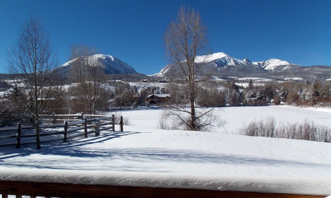 Enjoy spectacular views while vacationing at this beautiful newly remodeled duplex situated at the edge of a 10 acre lake. Step no further than the back deck for unequaled photo opportunities in the center of Summit County. Unobstructed views of the Gore Range provide a breathtaking panorama from the bedrooms, living room, dining room and kitchen. The kitchen has everything needed for meal preparation as well as more than ample dishes and silverware.