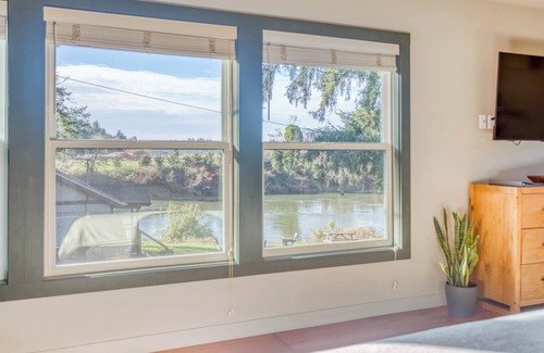 Watching the Nehalem River roll by while lying in bed is one of the best things about a stay in the third studio apartment of the Nehalem River Inn. With four large windows overlooking the river, you’ll have a front-row seat to the water, mountains, and wildlife of the Nehalem. Whether you’re enjoying alone time, a getaway with a friend, or a romantic weekend, you’ll appreciate the high-quality linens, heated floors, spacious walk-in shower, and double French doors that open to a deck with rockers for enjoying the view outdoors. A kitchenette and dining table allow for snacks, breakfast or take-out with ease. You’ll have access to the Nehalem River Inn’s gardens and outdoor spaces, including a fire pit alongside the river for s’mores under the stars.