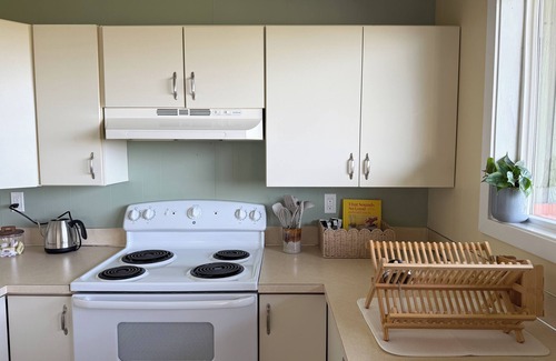 • Kitchen with cooking basics, Keurig, k-cups, cream, and sugar provided