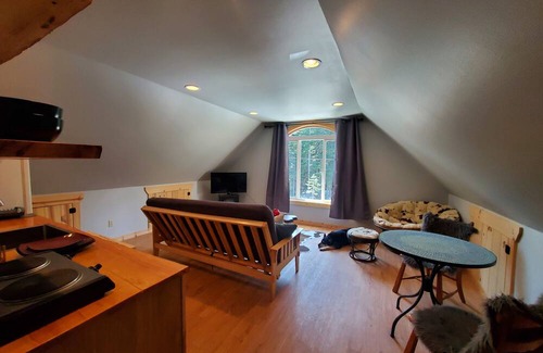 Light and bright Studio apartment - top floor. Friendly residential quiet neighborhood at the Summit of Snoqualmie Pass. Fully furnished with linens, towels and dishes. Approximately 275 square feet. Brand new Washer/dryer in unit. Bath with shower. 40" TV with Roku. Armoire and cubbies for storage. Propane heat keeps it cozy on cold evenings. New generator keeps the lights on during outages. Fast Speed Internet; work remote with outdoor adventure at your fingertips! Perfect base for endless outdoor activities.
