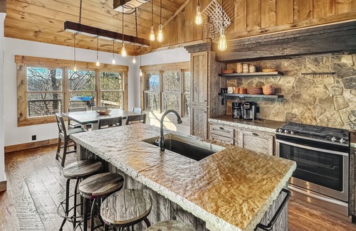 Custom designed by Keith Sumner, the cabin has a handsome stone facade that gives way to an exquisitely crafted and decorated interior that mixes rich, dark woods, vaulted ceilings, exposed beams and floor-to-ceiling windows that frame the astounding view. Three stacked stone masonry fireplaces, handsome leather furniture, hand-carved tables, and unique hand-crafted fixtures create a rugged, earthy atmosphere that's warm, welcoming and relaxing. You'll find ceiling fans and bear accents throughout, including a large taxidermy specimen overlooking the great room, where the cooking, dining and gathering areas blend into one.