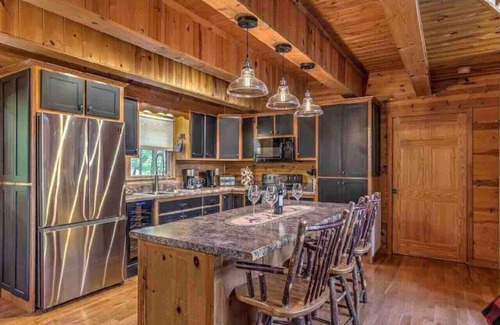 • Kitchen - fully equipped main level kitchen, black appliances, custom cabinets, breakfast bar seats 3, 28 bottle wine fridge, kitchen utensils, microwave, waffle maker, coffee maker, plates, cheese grater, blender, skillets, pots, pans, drinking glasses, wine glasses, champagne flutes, whiskey glasses, coffee mugs, salad spinner, serving dishes, place mats, can opener, wine opener, cooking knives, cutting board, mortar and pestle