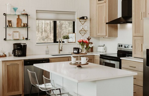 When you drive up to our property, located atop a mountain within the Kiamichi Mountain Range, you will be welcomed by a cozy patio with stunning views and the peaceful sounds of nature. Step through the doorway of the cabin, and notice the open, modern feel of the main area. Big open windows provide constant views and opportunities for spotting wildlife, which includes eagles, deer, birds, and even black bears (though we’ve never seen any! ;) ). Although modern, the cabin is filled with personal, cozy touches that represent the history and geography of the area and its Choctaw Nation heritage.