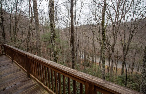 The main level deck is wrap-around and partly covered but mostly open-air, with Adirondack-style chairs and gliders and a gas grill. The lower deck is covered and features a hot tub and a porch swing. The decks and porches have wooded privacy, and you can look down at the New River as it meanders through the mountains!