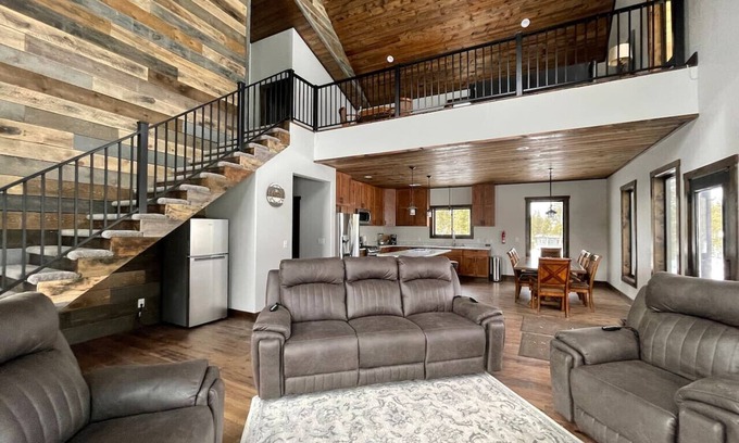 Inside, our modern rustic decor creates a warm and inviting atmosphere, fostering the perfect environment for quality time with family and friends or a wonderful setting for team-building activities. The open floor plan includes a spacious living area with a cozy gas fireplace and four reclining, heated massage seats as well as a fully equipped kitchen and dining area where stories are shared and bonds are strengthened as you relive the day's escapades or plan tomorrow's adventure.