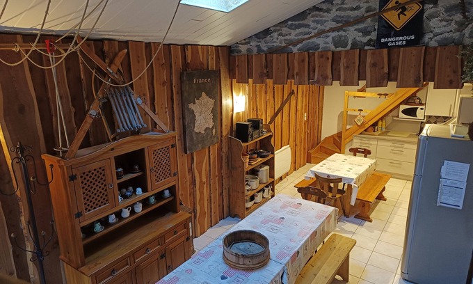 The gite with a large sleeping capacity was designed in an old barn; Its decoration made of stone wood and white walls is reminiscent of the interior of Savoy chalets; its decoration using old tools, allow with some explanations, a return to our civilization of the last century. Modernism has not been neglected, Television, DVD player, stereo with USB to read your music recorded on your tablets or laptops, board games, everything has been thought of for everyone's occupation and tastes; day corner, night corner, large corner, small corner, everyone will find their place and the rooms will be shared according to affinity ... for lovers of good food and especially for good (and even average cooks) a huge stove, the large bowls and the huge oven await you to delight all these little people. Without forgetting the 2 raclette machines, the 2 fondue machines.