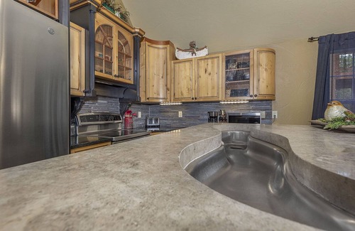 The home is designed especially for you and your family's seclusion, relaxation, and vacationing needs. As soon as you walk in you will be greeted by a floor to ceiling stone fireplace with a wood stove and a wall of windows. You can gather by the fire pit at night and roast marshmallows, enjoy a barbecue dinner on the large outdoor dining set, or just sit back and relax and listen to nature. The kids will enjoy their favorite shows in the professional movie theatre or a game of pool. The kitchen is fully equipped for all your cooking needs with quality custom cabinets, a serpentine stainless steel kitchen sink, granite countertops, and stainless-steel professional appliances! The kitchen table is made from an old reclaimed covered bridge with seating for 6.