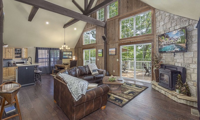 Mountain Creek Cabin - Luxury Lakefront Home - Hot Tub- Pool Table - Movie Theater is located in Lampe. Mountain Creek Cabin - Luxury Lakefront Home - Hot Tub- Pool Table - Movie Theater provides accommodation, featuring Balcony/Terrace, Bedding/Linens, Entertainment, among other amenities. This House features Balcony/Terrace, Bedding/Linens, Entertainment, to make your stay a comfortable one.
