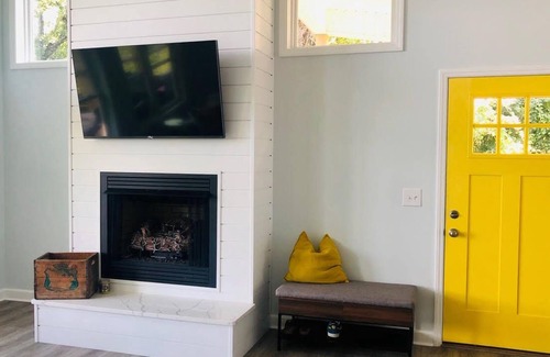 living room has a 60” smart tv above a gas fireplace.