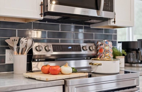 Cook for a crew with a fully equipped kitchen (full-size fridge/freezer, oven/stove, microwave, dishwasher, cookware/utensils, cutting boards, small appliances).