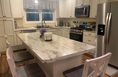 This is a 3 bedroom/2 bath home with upgraded kitchen cabinets and appliances. Completely stocked with spices and necessary utensils to cook that special meal or entertain family and friends. Two master bedrooms each with queen beds and their own bathroom access. Queen sleeper sofa with gel memory foam mattress. Sturdy, safe bunk beds with a third trundle that are perfect for kids and small-framed adults. Many places to gather: around the kitchen island, in the living room, on the spacious screened-in porch, at the picnic area, or around the fire pit. Also, designed with relaxation and quiet conversation in mind. Find your personal space at the bistro table on the back deck, at the outdoor contemplation/meditation area, in the den, or swinging on a double hammock. Easy to use propane fireplace with remote to create the perfect ambiance for cozy fall and winter nights. Dedicated workspace for remote workers.