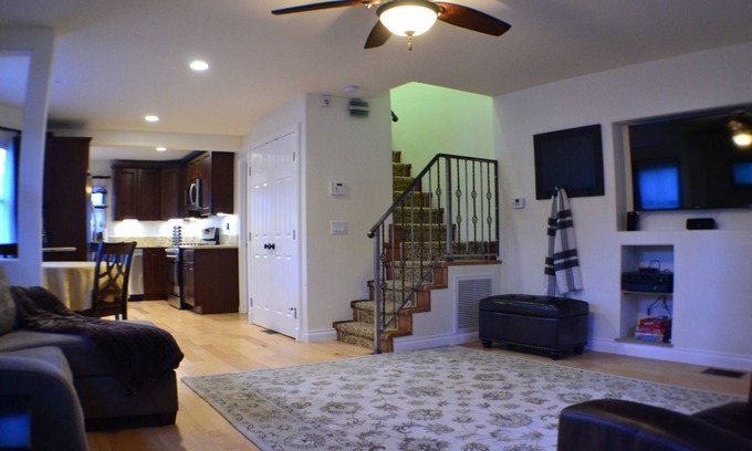This house has two identical but individual units. Each unit has three bedrooms and two bathrooms, Master bedroom has a California King bed, second bedroom has a queen bed with personal walk out balcony, the loft has two twin beds and the living room couch has a queen sleeper. Both have been completely remodeled inside with all new full size stainless appliances, new beds and furniture, granite counter tops, spa like bathrooms, full size washer and dryer, 55 inch flat screen TV, central air conditioning/heat, private balcony, wrap around porches, huge pine trees on a large lot with a fenced in area, all within two short blocks from the village.