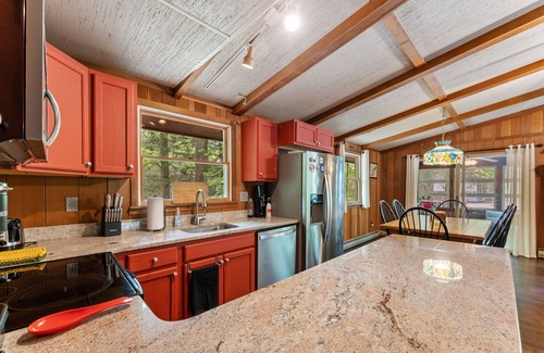 Our 3-bed, 2-bath cabin-feel home features an outdoor deck, grill, fire pit, plenty of board games and access to the community amenities. We have 2 mountain bikes and 2 kayaks you are free to use. Enjoy cozy nights by our indoor fireplace, or relax by a real fire outside under the stars. We are happy to provide firewood.