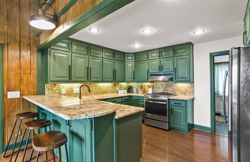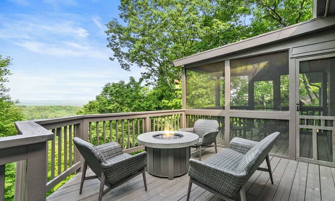 A breathtaking view and flood of natural light greet you on the main level where the family room, dining room, kitchen and sunroom create a vast open floor plan. Guests will enjoy plenty of comfortable seating in the Family Room with a large, stacked stone wood burning fireplace for the authentic mountain experience. Gather around the huge dining table to eat, do puzzles, or catch up with loved ones. Lounge in the sunroom on the oversized, plush sectional sofa to read or watch the brand new large screen smart TV. The kitchen provides charm and everything you need to create the perfect Thanksgiving Feast or just heat up your leftovers for a low maintenance meal. There are also two expansive decks and a screened dining area to be able to enjoy the spectacular view while you gather around the firepit or relax in the swinging chairs.
