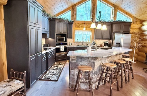As you step into the cabin, you'll be greeted by a warm and inviting open concept living room and kitchen, the perfect space for cozy gatherings. The large modern kitchen is equipped with everything you need to cook for your group. The great room features beautiful architecture with a cathedral ceiling and a propane fireplace, a comfortable (reclining) living room set, a coffee table, and a 72 inch smart TV. The main floor also features a dining table and a large bar, making it the perfect place for movie nights or meals together. The game room has a pool table, a sectional sofa and coffee table, a 52 inch smart TV, a dart board and a bar, making it the perfect spot for game or movie nights with your group!