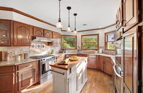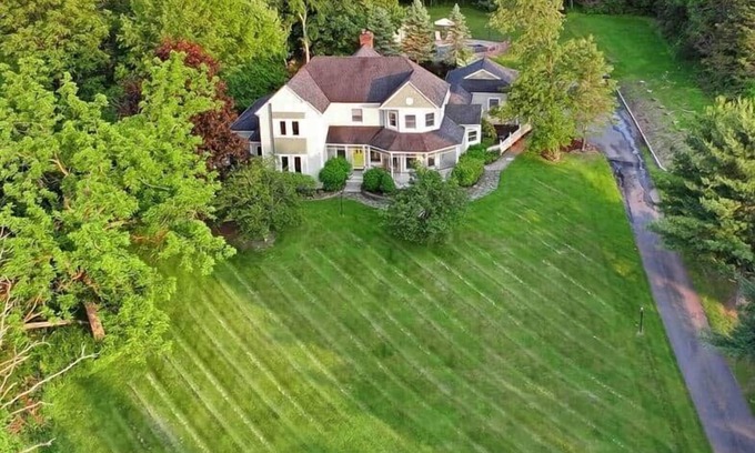 Discover the perfect blend of mountain charm and luxury on several acres just minutes from Downtown Warwick. This serene retreat features stunning Hudson Valley views, a heated pool, covered outdoor kitchen with fireplace, and elegant indoor spaces including a Great Room and cinematic media room. Enjoy wineries, orchards, hiking, skiing, and more all within 15 minutes and just one hour from Manhattan. Begin your mornings enjoying coffee on the front porch rocking chairs while taking in breathtaking Hudson Valley views. Spend your days in the entertainer’s paradise featuring a heated pool with chic pool furniture. The covered outdoor kitchen boasts a wood-burning fireplace, grill, large TV, and comfortable lounge seating designed for year-round relaxation and fun. Retreat to the elegant Great Room and unwind beside the majestic stone fireplace, or immerse yourself in the cinematic media room with a 100-inch screen and surround sound. For lively evenings, indulge in a curated collection of games within the stylish rec room, designed for endless entertainment. End your evenings by the fire and under the stars, or rest easy in beautifully appointed bedrooms with plush memory foam mattresses for a peaceful night’s sleep. This home is your ultimate getaway—a perfect place to connect, recharge, and create unforgettable memories. -2 minutes to Apple Dave's Orchard and Distillery -2 minutes to Shalimar Alpacas Farm -5 minutes to top-rated Drowned Lands Brewery -5 minutes to Warwick shopping and restaurants -10 minutes to Warwick Valley Winery and Distillery -10 minutes to Mt. Peter -15 minutes to Legoland -15 minutes to Appalachian Trail -20 minutes to Mountain Creek Ski and Golf Resort -20 minutes to Crystal Springs Resort Spa and Golf -20 minutes to Woodbury Commons Outlets -30 minutes to Delaware River With so much to explore nearby, every day offers a new adventure or a peaceful escape. Feel free to reach out by phone or message. 1 hour from Manhattan, Bus from Port Authority to Warwick (196 Express or 197), Transportation by car is the easiest method for getting around town however, Uber is available if you choose transit. Parking for up to 7 vehicles. The main level is accessible via a single step from the back patio, providing easier entry for guests with limited mobility. This level also features a thoughtfully designed bedroom complete with a step-in shower, ensuring comfort and convenience during your stay.