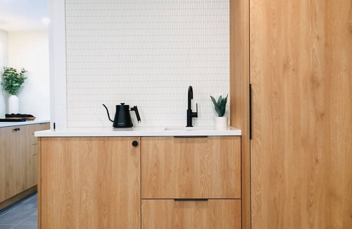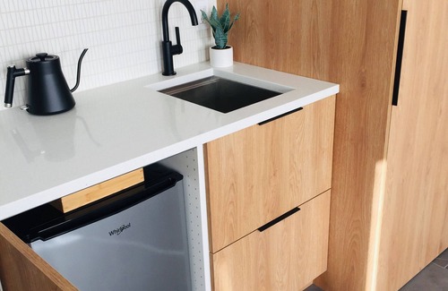 Mountain Modern is situated above the main garage and has a separate entrance with keypad entry and dedicated parking for our guests. The extra large bedroom has a slanted ceiling and is set up with two queen beds, complete with organic bedding. The oversized luxury bathroom has a walk-in glass enclosed shower outfitted with shampoo, condition and bodywash. There is a kitchenette with sink, mini fridge, microwave, toaster oven, toaster, kettle and electric griddle provided for light cooking and reheating of food. And a stackable washer and dryer in the unit that includes laundry detergent and dryer sheets for your personal use. The kitchenette also has a french press and Mr. Coffee coffeemaker (coffee and sugar + honey provided). It has all the modern conveniences from home one could ever need.