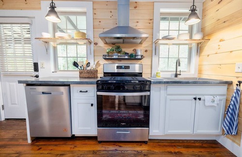 A fully equipped kitchen with modern appliances and all the essentials makes meal preparation a breeze. The kitchen area features rustic simplicity while the living and dining area capture the essence of what the Ivy Cottage is.