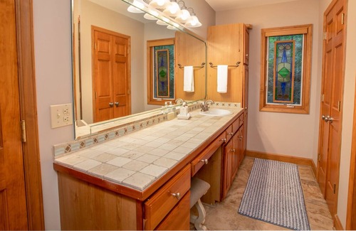The lower level features a large game room with a second fireplace, an HD Smart TV, a bar with a fridge, a pool table, a Multicade arcade machine, a poker table, a dartboard, and more! The adjacent den provides another cozy living area with comfy leather sofas, one of which opens to a Queen sleeper. The den can also serve as a sleeping area, with the Queen sleeper sofa and an adjacent full bathroom with tub and shower, also accessible from the main hallway. There is a large covered deck off the game room with a step-down open-air hot tub platform. Finally, on the lower level is a huge bedroom suite with a King bed, Twin-over-Full bunk bed, HD Smart TV, and private ensuite full bathroom.