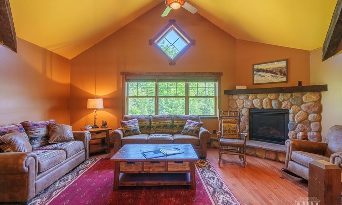 Enter a mudroom area with benches and space for outdoor gear. The main floor holds 3 bedrooms: the primary bedroom with a custom log King bed and en suite full bath, a custom log Queen bed with en suite full bath, another Queen bedroom, plus a full bath and washer/dryer in the hall. The upper level has an open floor plan with an inviting main living space including a gas fireplace, fully equipped modern kitchen with a breakfast bar and 4 stools, and a dining table with 6 chairs. There is a den off the main living area with seating and a 65” Smart TV. The lower level holds the fourth bedroom with 4 twin beds, and a spacious recreation area with a pool table and sitting area with 65” Smart TV.