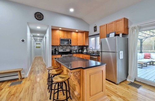 10 minutes to Hunter Mountain, 16 minutes to Windham, 24 minutes to Kaaterskill falls. 4 bedrooms with queen beds and 1 room with 2 bunk beds (up to 4 kids). Game room with pool table, air hockey, foosball table, darts, a bar and a TV. Hot tub, patio with outdoor seating, firepit, spacious backyard, 3 bedrooms have mountain view. Outdoor security cameras: overlooking the back yard and overlooking the front entrance. Like any mountain-ey location cell phone service is very intermittent.