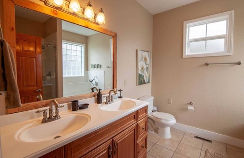 The king master suite is on the main level. It enjoys mountain views and has an HDTV, a glass door out to a covered Juliette deck, and a private ensuite master bathroom with a level-entry shower and a soaking tub. Also on the main level are a large pantry and laundry room and a half bathroom/powder room. There is a large covered deck that wraps around three sides of the house. There is a gas grill on the deck.
