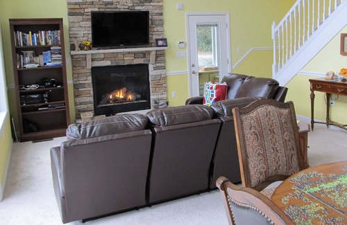 UPPER AREA has living room with 55" TV flat screen above a gas fireplace. There is high speed Wi/Fi internet. Full kitchen and dining area plus 1/2 bath. There is a washer/dryer. There is also a large, 12' x 40' deck, with table and chairs overlooking pond and picnic area.