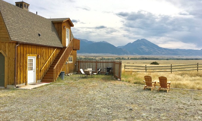 The rental is on the second floor of a decorative barn, which never housed animals. It is located on Old Yellowstone Trail North, which was originally cited as a buffalo trail, then Trail Creek Road, and then under the current name because it served as the stagecoach trail to Yellowstone National Park after the park opened and before a railroad spur was built to the park.