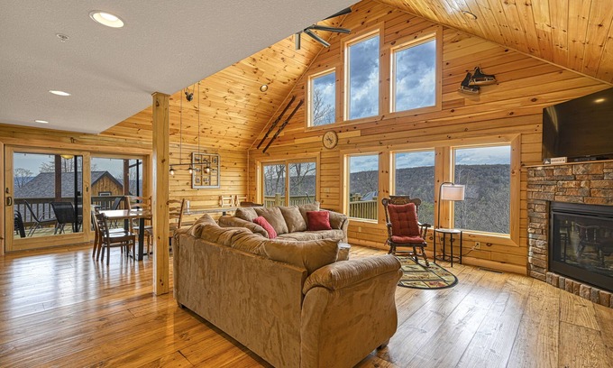 Mountain-view home with hot tub, elevator, balcony, WiFi, AC, & pool table | Cabin in McHenry