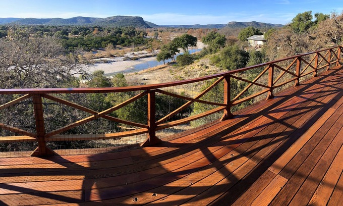 Mountain View Lodge lies on the western edge of the scenic Texas Hill Country, offering spectacular views and sunsets--great for gatherings large or small. This modern, 2-story (2,400 sq ft) lodge is along crystal-clear, spring-fed Pulliam creek (Middle Prong of the Nueces River), which is ideal for swimming, tubing, and snorkeling. A 5-ft-deep swimming hole is at the lodge. Nearby is a large natural spring.