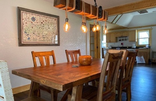 The inside of this alluring space is quite cozy and comfortable, with each room of the spacious 2100 square foot lodge having its own interesting theme. Whether you want to relax and enjoy a cup of hot coffee in front of the gas fireplace, watch a game in the family room or take a hot bubble bath in the inviting master bath, the interior has something for everyone, including your pup!