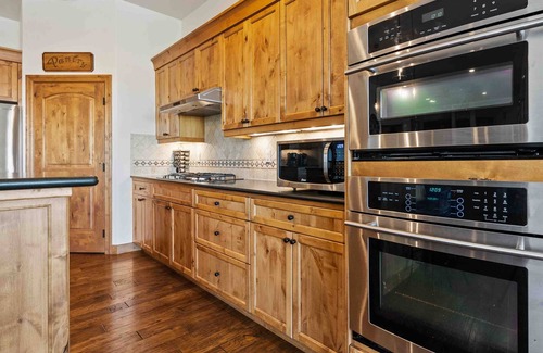 The kitchen is a dream for anyone who loves to cook or simply gather. Granite countertops stretch across generous prep space, stainless steel appliances gleam, and the fully stocked cabinets mean you can whip up everything from pancake breakfasts to multi-course dinners without missing a beat.