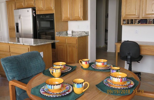 The bookcase has DVD's, books and games. The desk has a Surge Protector Power Strip, table lamp and is ready for your laptop. The Arizona room has another option for eating, enjoy a meal there, listen to the waterfall and check out the mountain views to the South. The back yard has a built in propane gas grill, seating for 8+ with chairs and low table, Chimera, the water feature, and planters with roses. Beyond the yard is a buffer zone, another area to observe nature. The front patio has table and chairs, enjoy the sunrise, and in the afternoon will give you the shade. The laundry/utility room is between the kitchen and garage, has high efficiency Maytag washer and dryer. The two car over sized garage has plenty of storage cabinets.
