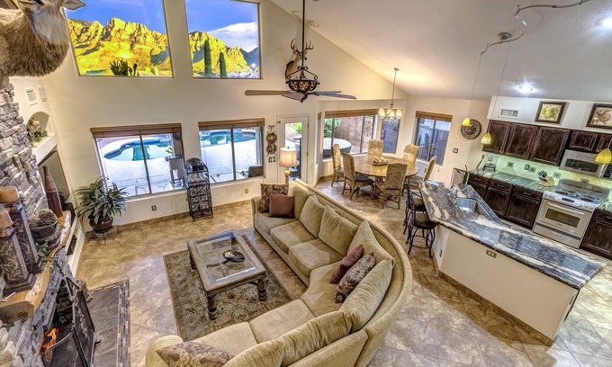MOUNTAIN VIEWS, KOI POND, HOT TUB, POOL, 1GIG WIFI, 1/2 mile Starbucks/Safeway! has 4 Bedrooms , 2 Bathrooms, and max occupancy of 8 people. The minimum rental for this property is 1 nights, but this can change depending on the season you plan on staying. Previous guests have given good rated it, and VRBO labeled it a top-rated House because of the excellent services rendered by the owner or manager of this House, and has consistently provided great experiences for their guests. Most families or guests that use it recommend it to their friends and some of them are repeat guests. House has a friendly neighborhood, and the Rancho Vistoso has interesting places to visit. If you want to learn more about the House in Rancho Vistoso, such as places to visit and things to do nearby, you can check below to learn more.