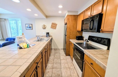 Each of the two bedrooms offers a quiet, private retreat, and with three full bathrooms, there’s plenty of space for everyone to refresh and relax. Whether you're vacationing with friends or family, the smart layout provides both communal space and personal privacy. Additional perks include in-unit laundry and convenient ski storage within the building.