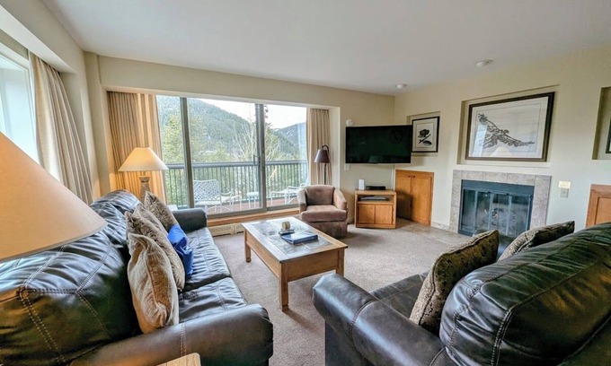 Inside, you’ll find a warm, open-concept living space with rich wood accents and large windows that frame serene forest views. A gas fireplace adds cozy ambiance, making it the perfect place to relax after a day on the mountain. Step out onto the private balcony to sip your morning coffee or wind down with a glass of wine as the sun sets behind the trees.