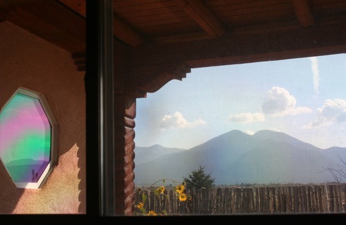 Come enjoy the glorious views of Taos Mountain and the Sangre de Cristo Range from Luna Vista just outside Taos.. Summer is coming on so book for this popular season of warm days and cool nights. There is lots to do in the area. Visit Taos Pueblo, eat at any number of excellent restaurants or shop around the Plaza. Or, stay home and relax in attractive Southwestern surroundings and comfort. The house, patio and hot tub all have stunning views. The kitchen is large and well-equipped. The house sleeps five, depending on family/friends preferences. Sleeping features are a bedroom with a massive king sleigh bed and another room with two queens. The sofa pulls out to a queen in the living room as well. The house is built with traditional viga (beam) ceilings and tile floors, and sports furniture built for comfort. There is original Southwestern art work on the walls and a cozy TV nook with recliners off the living room. The banquet-style dining room table is great for entertaining but the home encourages intimate get-aways as well. Keep us in mind and we hope to see you soon. Please note that the $160 per night rental fee covers two people. Additional guests are $20 per person per night.
