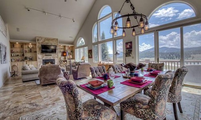 The table is lit with an elegant chandelier and beautiful outdoor views of Lake Dillon.