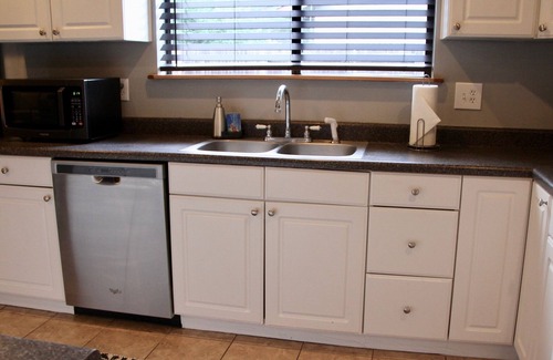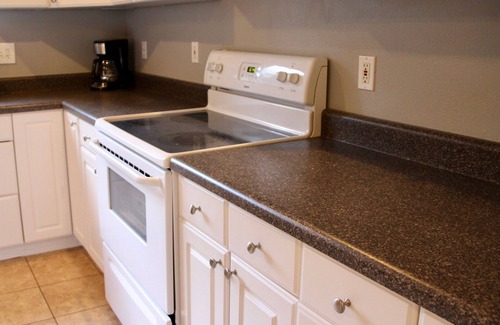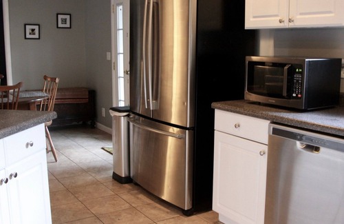 The kitchen is outfitted with a large island; making meal preparation a social event. The kitchen features stainless appliances, oven, refrigerator, microwave, coffee maker, toaster, blender, dishwasher, and a full complement of cooking utensils and dishware. There is seating for two around the island for casual dining, as well a dining room table that seats up to six.