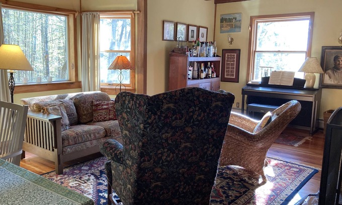 Our house sits on a wooded mountainside slope. The house itself is built from a variety of beautiful woods including cherry floors and wideboard pine. There are lots of places to read, relax, and enjoy glorious sunsets.