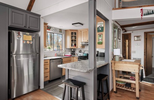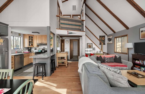 Enjoy a relaxing retreat in this serene mountain house with soaring ceilings, wooded views all around, and great sleeping options for everyone. We’re also dog-friendly!