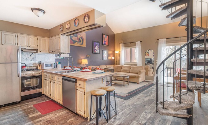 Our condo is renovated with vibrant colors and eclectic furnishings. End unit, upper level with a large private deck with breathtaking views. Master bedroom on the main level, second bedroom is a loft. Comfortable and cozy space - perfect getaway for a couple, a family, girls' spa weekend, guys' golf weekend. For a small fee ($20 per stay) we’ll even set you up with a baby/toddler crib. 4 legged guests also welcomed with their responsibilities handlers for a small added cleaning fee. ($50). ToughMudder / Spartan races and Bike races or relaxing yoga outings- You'll love our beautiful condo!