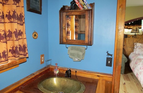Mr. Ed’s Cabin is decorated in cowboy and western style with moose themed light fixtures, antiques and original artwork. The cabin has a front porch, an attached horse coral (horse is optional) and private fenced in garden. The Cabin is a studio and has a queen bed and a single pull out sofa, comfortably sleeping three. There is a kitchenette with a 3 burner cook top, below counter refrigerator, microwave and a large toaster oven. The bathroom has a small poured concrete tub in the shape of a barrel with wagon wheel shower head, toilet and vanity. Comfortable in the winter and summer the cabin has air Conditioning, heat, Direct TV and a DVD player. Mr. Ed’s is a perfect weekend getaway or long term rental for couples, small families and friends.