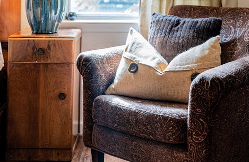 Inside, the 1st floor, open concept living area is all opulence with an eclectic blend of gorgeous artwork and globally influenced decor. Facing the home’s smart tv, large plush couches can fit much of your group for a cozy movie night. In the next room, another large sectional couch can seat the rest with a beautiful bar cart stocked with glassware just steps away. The kitchen is adjacent with more reclaimed wood, stainless steel appliances, blender, coffee maker, and toaster. Barstool seating at the counter provides a space to gather in the kitchen to enjoy company and good food.
